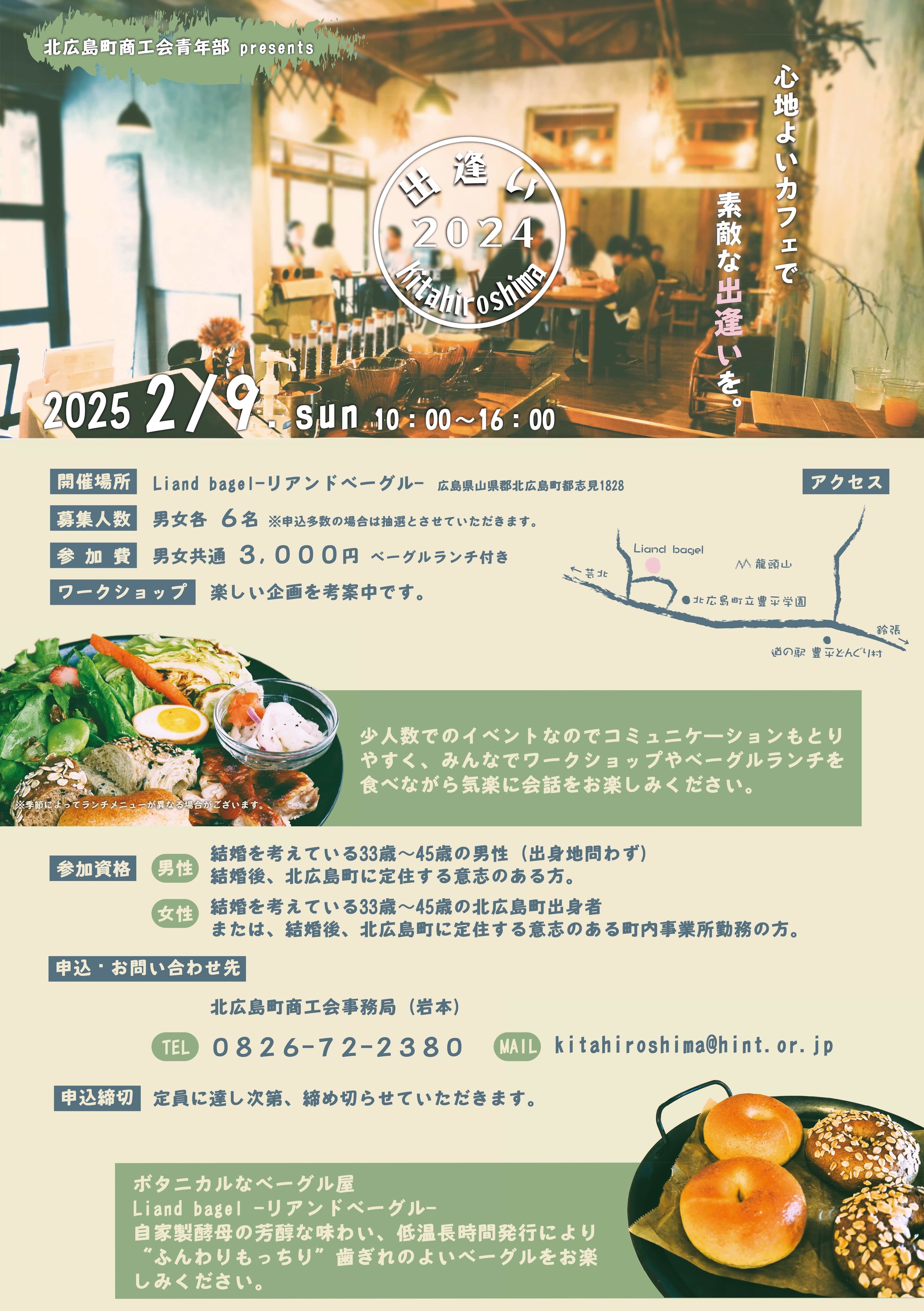 HOME | イベント情報 出逢い2024 kitahiroshima 2025年2月9日(日) 10:00~16:00 会場:Liand bagel -リアンドベーグル- 「心地よいカフェで素敵な出逢いを。」 募集人数:各6名 参加費:男女共通3,000円 ワークショップ:あり 申込・お問合せ先:北広島町商工会事務局(岩本) ☎0826-72-2380 ✉kitahiroshima@hint.or.jp